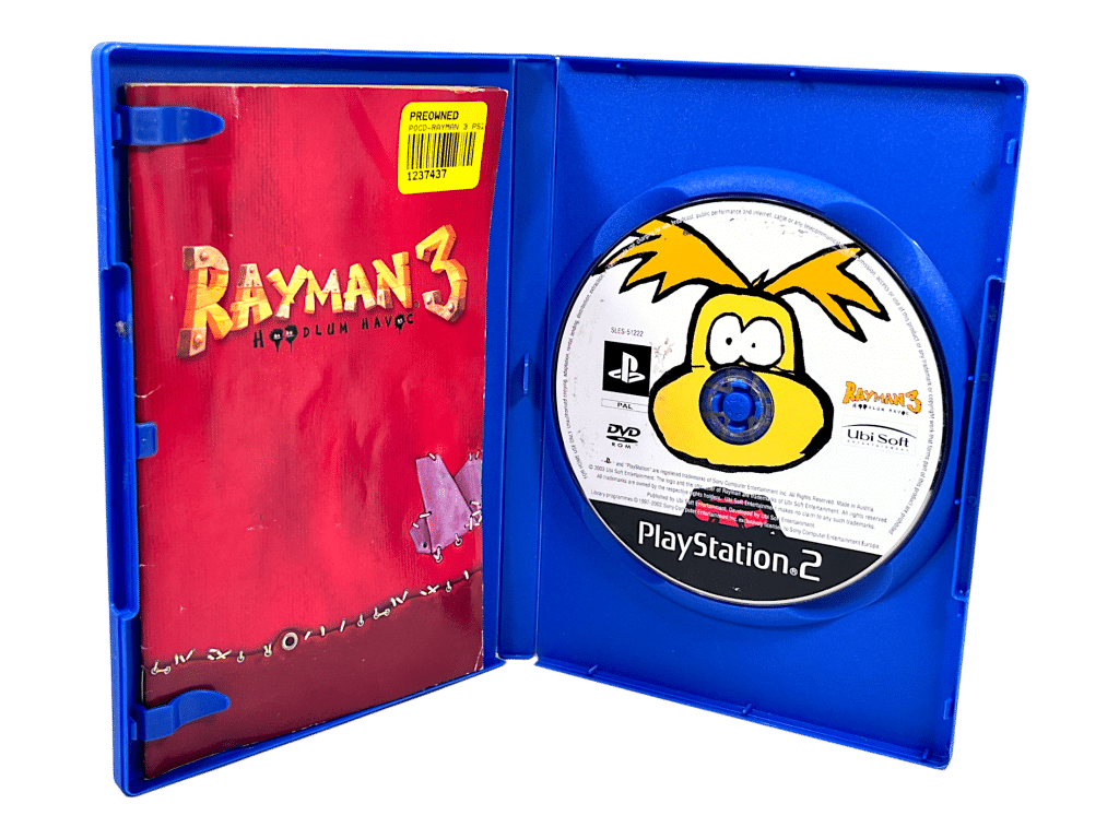 RAYMAN 3 HOODLUM HAVOC for SONY PlayStation 2 / PS2. This preowned game disc is in excellent condition and comes complete with pictured case + cover + manual / booklet. Cover has some paper wear (markings and some light paper creasing), and an old price sticker is fixed to the front cover of the booklet as pictured (Refer Image 3).