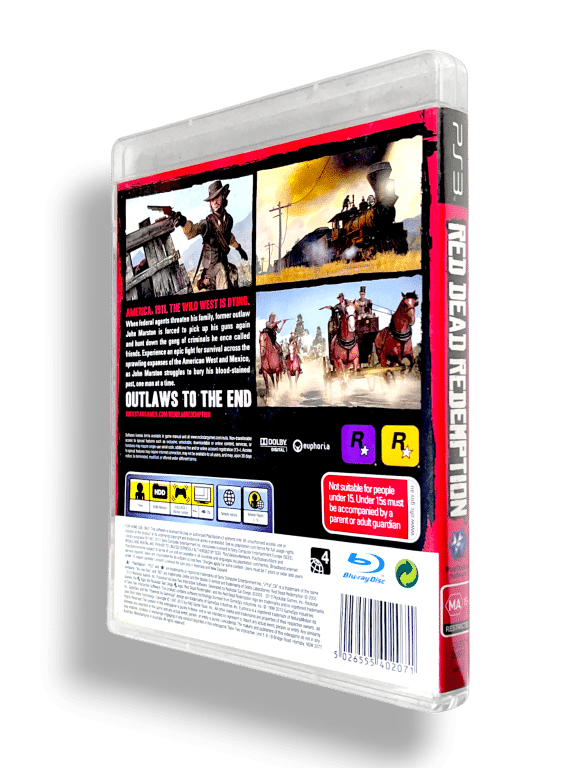 RED DEAD REDEMPTION for SONY PlayStation 3 / PS3. This preowned game is in good condition and includes case + cover + instruction manual + game disc. There is a tiny paper tear at the top of the paper cover, which is visible and not photographed. Everything else is excellent, with the manual and disc in fantastic condition inside.