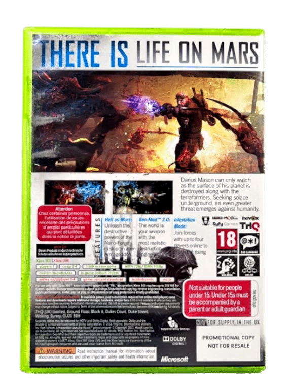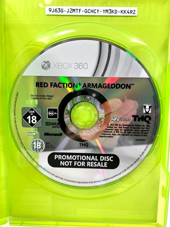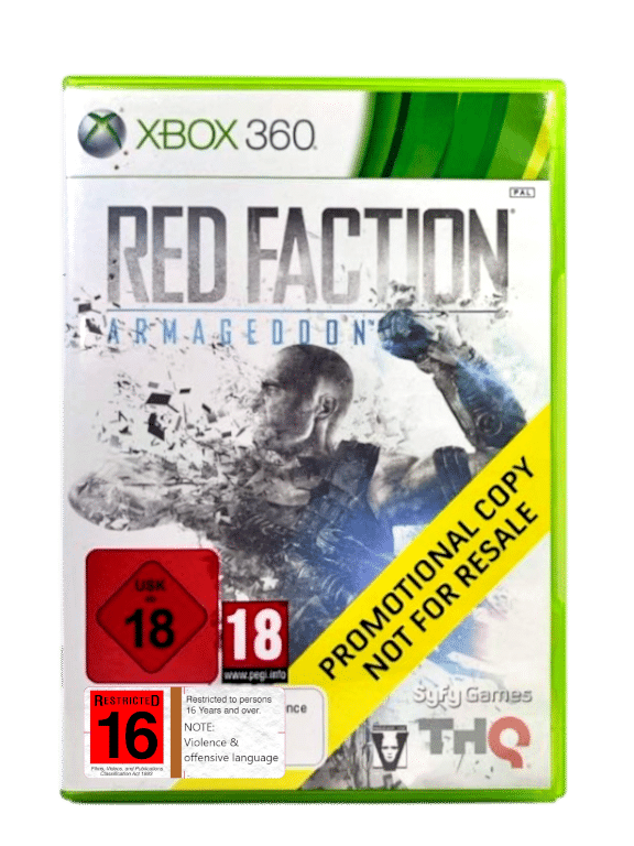 RARE FIND: Authentic Pre-Release Promotional Copy in MINT condition & 100% complete with contents: Red Faction Armageddon for Xbox 360. This preowned game is in Mint condition – a very tidy and complete collector’s item – with genuine pre-release promotional case + cover + game disc (no manual was ever printed for this pre-release edition).Â