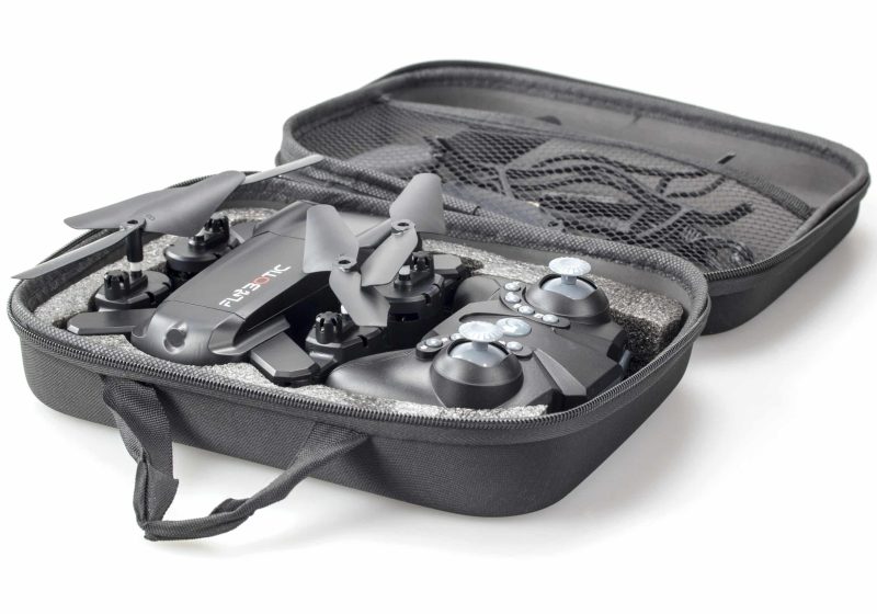 FLYBOTIC Foldable Drone. The foldable drone with 33 cm camera. A drone that you can take anywhere! With a 480 pixel camera, it is perfect for incredible shots. Thanks to the floating flight, it is easy to control and fits in any hand. Light effects and 2.4GHz technology for outdoor use. Charge the battery via a USB cable (included). 2 replacement sheets included. Ages 14 and up.