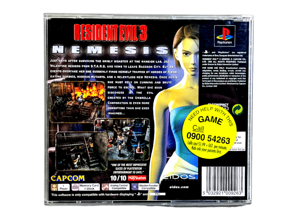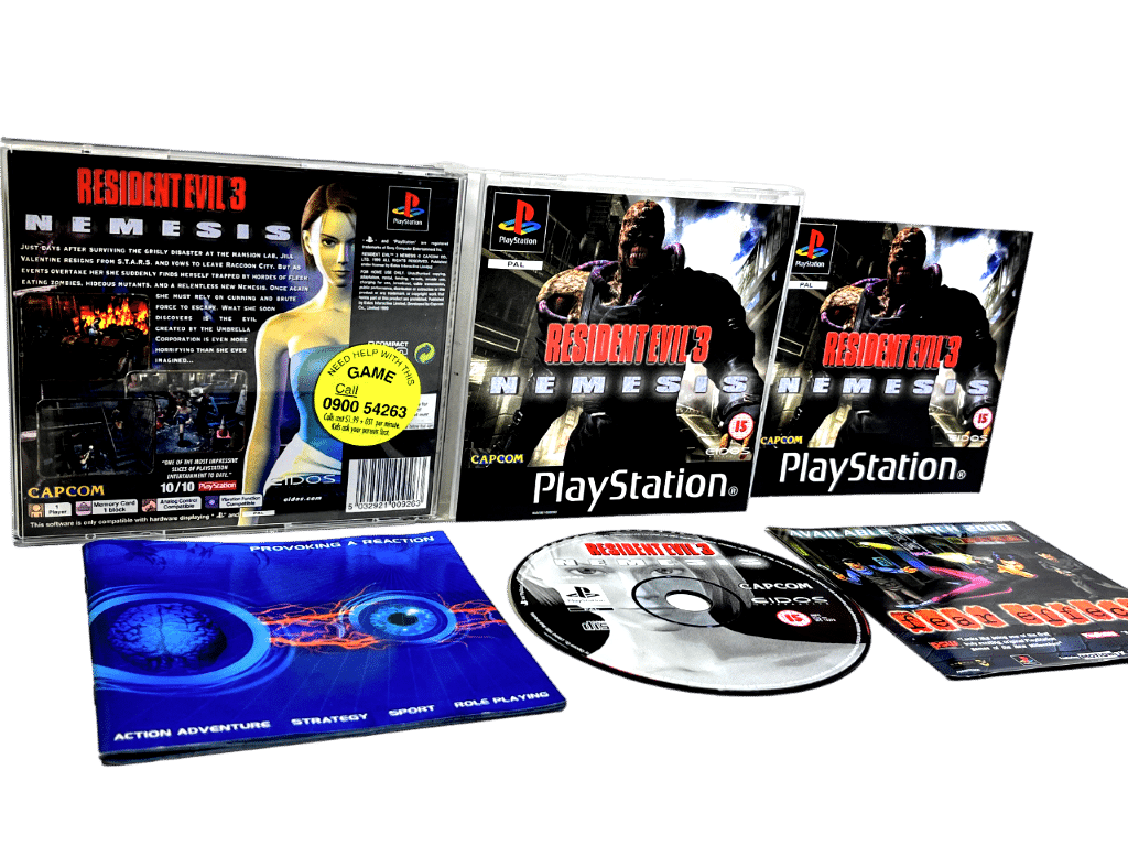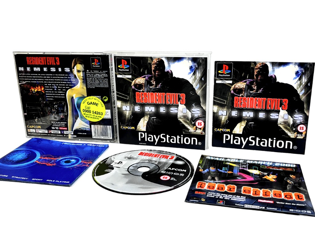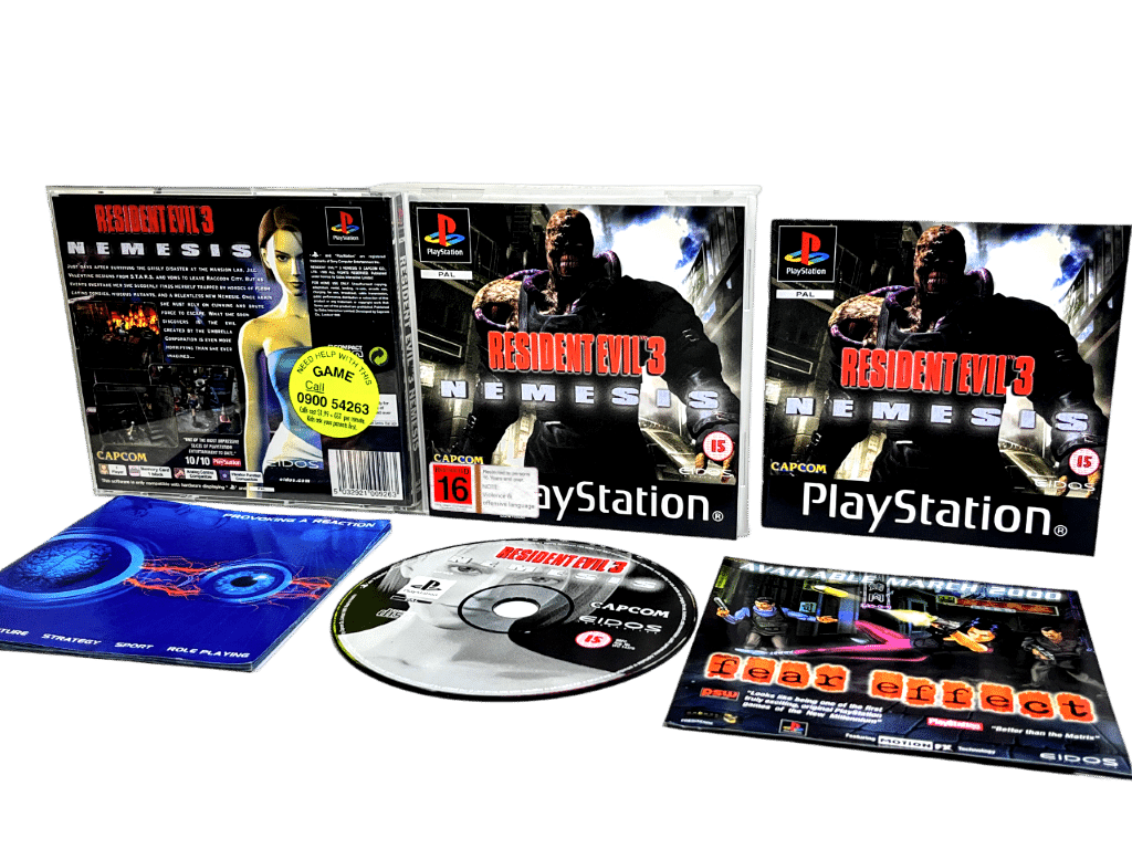 Excellent Condition & 100% Complete with Contents: RESIDENT EVIL 3 NEMESIS for SONY PlayStation / PS1. This preowned game is in very tidy condition and comes complete with case + cover + manual / booklet + internal promotional catalogue + card + game disc. One of the tiny plastic hinges on the corner of the case has broken, and the disc has some very fine superficial scratches, but these are purely cosmetic, and overall this is a tidy and complete collector’s item as pictured.