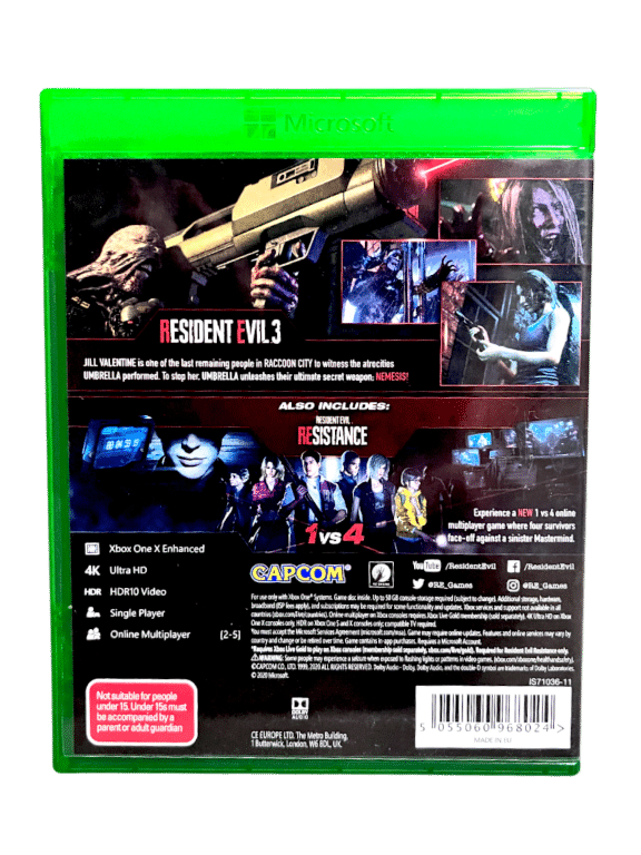 Excellent condition & Complete with Contents: Resident Evil 3 for XBox One. This pre-owned game is in superb condition and complete with original case, cover, and game disc.