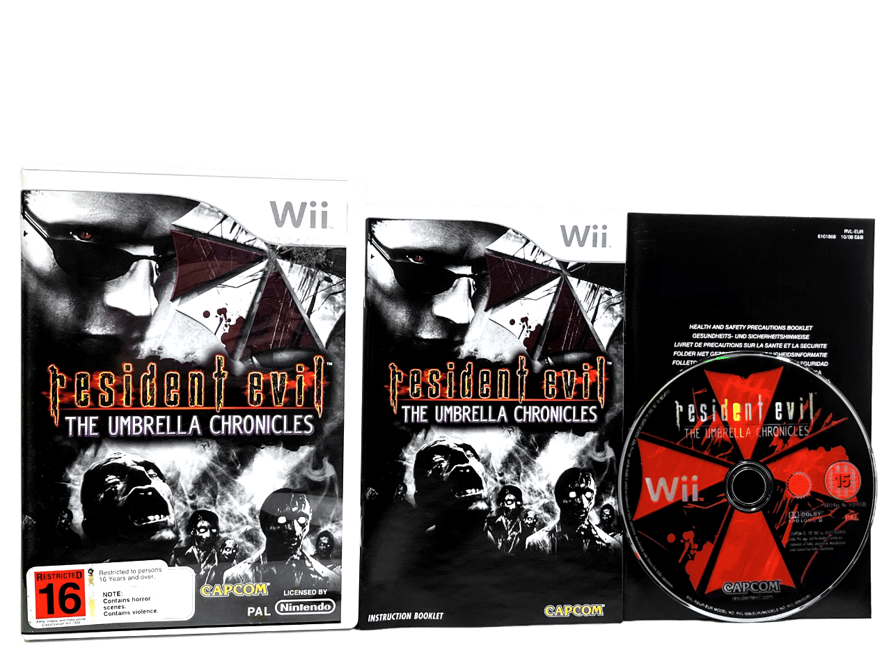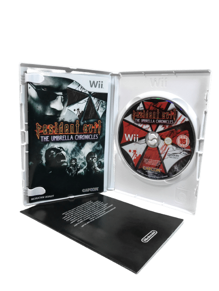 100% complete with contents: RESIDENT EVIL THE UMBRELLA CHRONICLES for NINTENDO Wii. This preowned game comes complete with case + cover + manual / booklet + game disc. Booklet has some light paper creasing, cover sun gentle sunfade, and the disc some light superficial markings / cosmetic scratches, but these are cosmetic imperfections only which do not affect game play in any way.