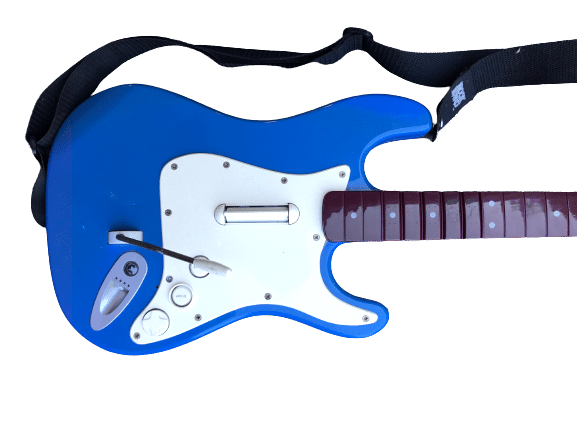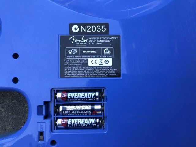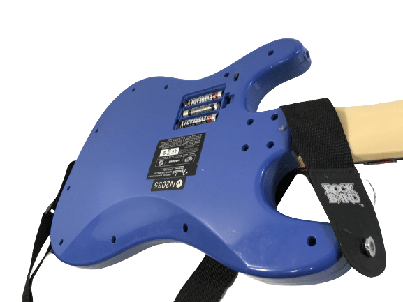 RARE AUTHENTIC EDITION 3 (ROCK BAND VOLUME 3 GUITAR – BLUE) PS3 COMPLETE PLAYING BUNDLE (GUITAR + GAME): Official Harmonix PlayStation 3 RockBand 3 Fender Stratocaster Wireless Guitar + Wireless USB Dongle (receiver / adapter) + ROCK BAND 2 The Game. This genuine preowned PlayStation 3 Playing Bundle is in good condition and perfect working order, with mild cosmetic imperfections only which do not inhibit functionality or game play in any way. Guitar takes 3 AA Batteries (batteries not included). Guitar comes complete with guitar strap. Missing small plastic battery hatch, but batteries stay firmly in place, and can be covered securely with tape (works just as well as the original battery hatch!). A complete playing bundle, ready for its new owner.