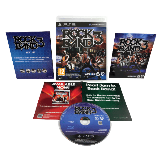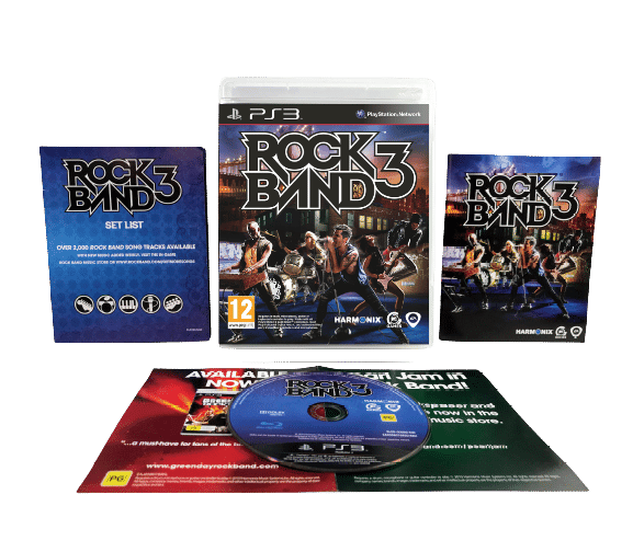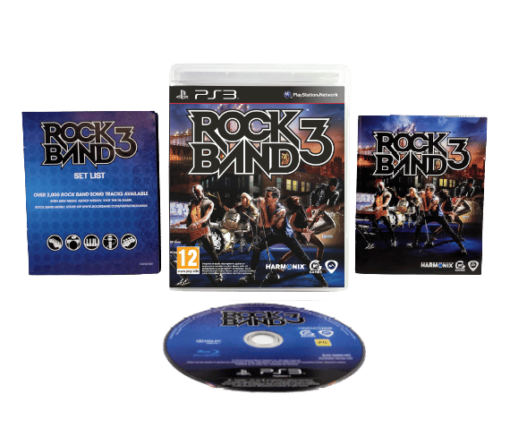 Excellent Condition & 100% Complete with ALL Contents (including manual / promotional booklet and leaflet): ROCK BAND 3 / RockBand 3 / Rock Band III / RockBand III for SONY PlayStation 3 / PS3. This preowned game is in superb condition and comes complete with case, cover, manual / booklet, and game disc. Genuine US Print with the signature “T” for “teenager” embedded in the cover art in place of the pictured “12.” The game on the disc is identical.