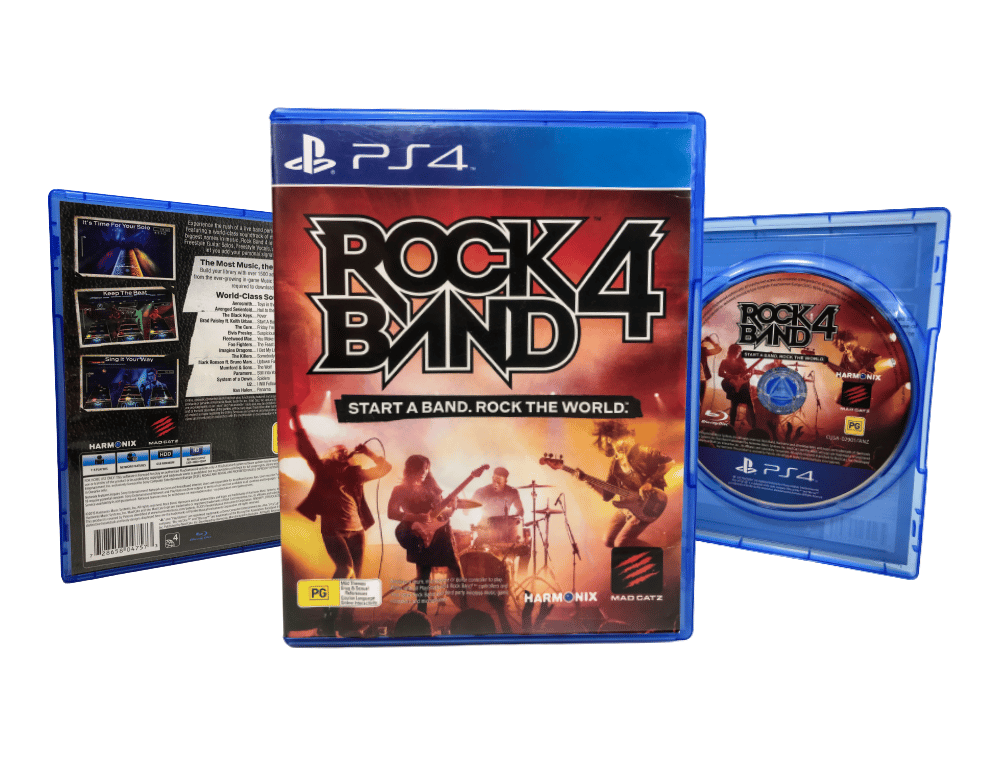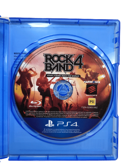 RARE PS4 ROCK BAND SET: ROCK BAND 4 / RockBand 4 the SONY PS4 Edition. This preowned Genuine PlayStation 4 RockBand Bundle is in good condition, and impossibly scarce compared with all other Rock Band / Guitar Hero / Band Hero Releases. Official Rock Band product. Mild markings and superficial imperfections only. The game is in excellent condition and complete with case + cover + game disc. A complete playing bundle, ready for your next party!