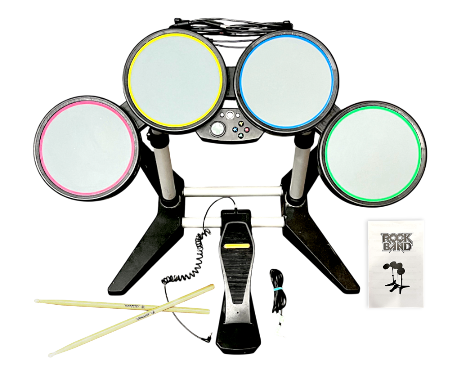 Rock Band Drum Kit Controller (Xbox 360 Rockband DrumKit). This preowned Xbox 360 Rock Band Drum Kit is in good condition and includes GENUINE ROCK BAND Drum Sticks / Drumsticks + Pedal + Leads. A small area of rubber has come away on one of the cords, but this is purely cosmetic and does not affect operation in any way. Includes pictured contents. Refer photographs. This item is VERY LARGE and we would prefer local pick up if possible.