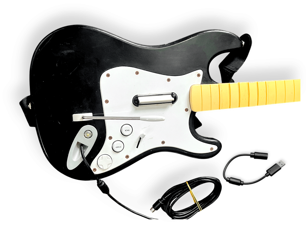 RARE XBox 360 Wired Guitar compatible with both Xbox 360 and PC: Official Harmonix XBox 360 RockBand Fender Stratocaster Guitar / ROCK BAND GUITAR PLUS Rock Band the official game for Xbox 360. This genuine preowned XBox 360 RockBand guitar is in good condition and perfect working order, and the game is also in good condition and complete with case + cover + manual / booklet + game disc. Guitar has visible cosmetic markings and surface imperfections, but these are purely superficial and do not affect its performance or functionality in any way.