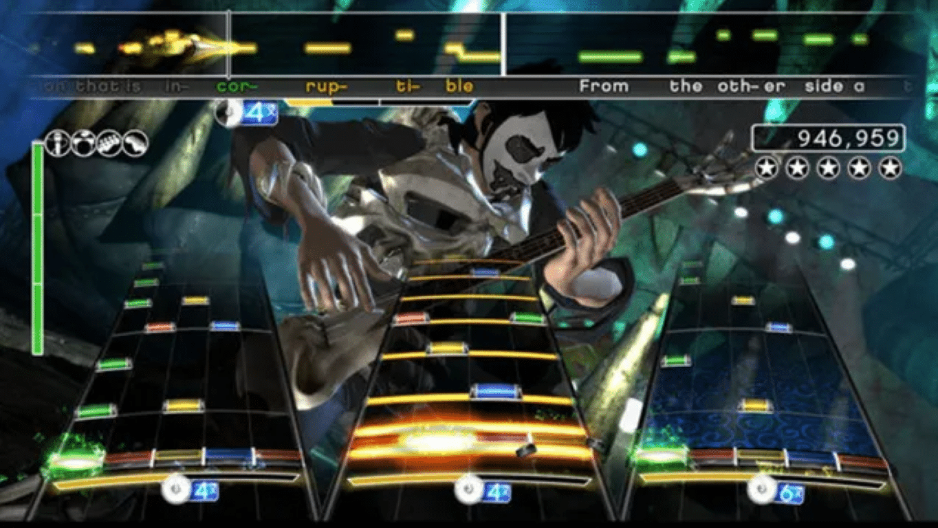 Familiar Rock Band gameplay.