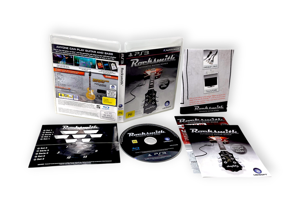 Excellent condition & complete with Manual + Instructional Poster: ROCKSMITH: Learn To Play Guitar for SONY PlayStation 3 / PS3. This preowned game comes complete with case + cover + manual / booklet + instructional poster + game disc.