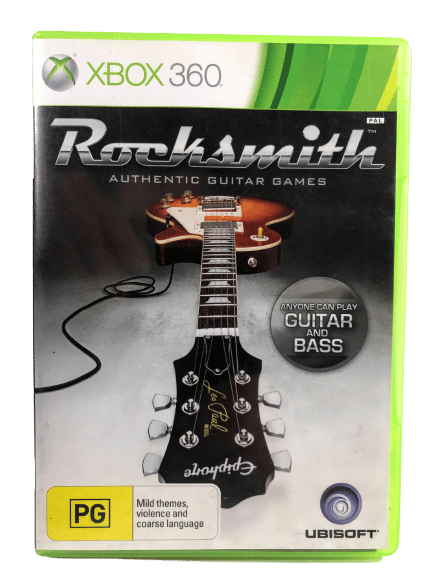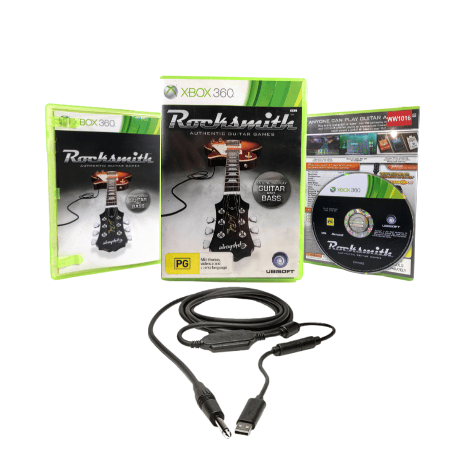COMPLETE PLAYING BUNDLE: Rocksmith game PLUS Offiical Ubisoft Realtone Rocksmith Cable. ROCKSMITH: Learn To Play Guitar for Xbox 360. This preowned bundle is in mint condition, with the Real Tone Cable NEW IN BOX. Game comes complete with case, cover, manual / booklet, and game disc.