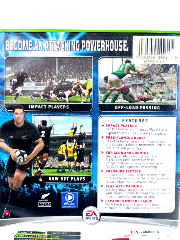 Taste the tension and take the big hits as EA SPORTS Rugby 06 slams you back into the scrum for the most realistic and intense rugby experience yet. Keep the match flowing with new off-load passing and quick set plays and get as close as you can get to the mud, sweat and tears of the real thing with faster, more realistic and responsive gameplay. Drive your team to victory with effective use of your impact players whose innovation, inspiration and discipline can mean the difference between a humiliating defeat and a spectacular win. When the pressure is really on and the game is on the line, resort to tough tactics to neutralise your opposition’s impact players. Used at the right time, laying a high hit on an opponent can turn the game in your favour. But remember, it’s just as likely to hand the advantage to your rivals – and land your player in the dreaded sin bin. With authentic teams and players, more expansive gameplay and all-new hard-hitting action, EA SPORTS Rugby 06 lays bare the heart and soul of the greatest game on earth.