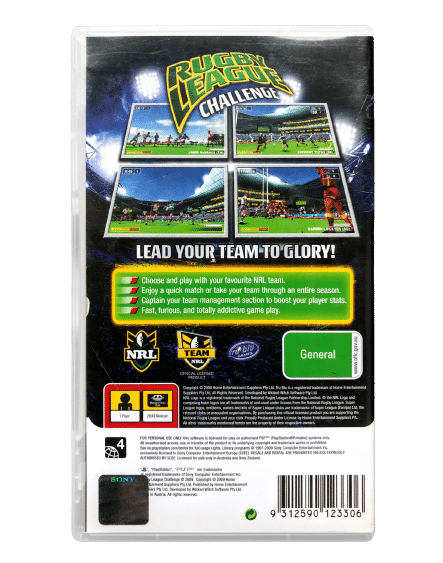 Excellent condition & 100% complete with contents: RUGBY LEAGUE CHALLENGE for SONY PSP / PlayStation Portable. This preowned PSP game is in excellent condition, complete with case, cover, manual / booklet, and game disc. Case has mild laminate wear, but this is purely cosmetic.