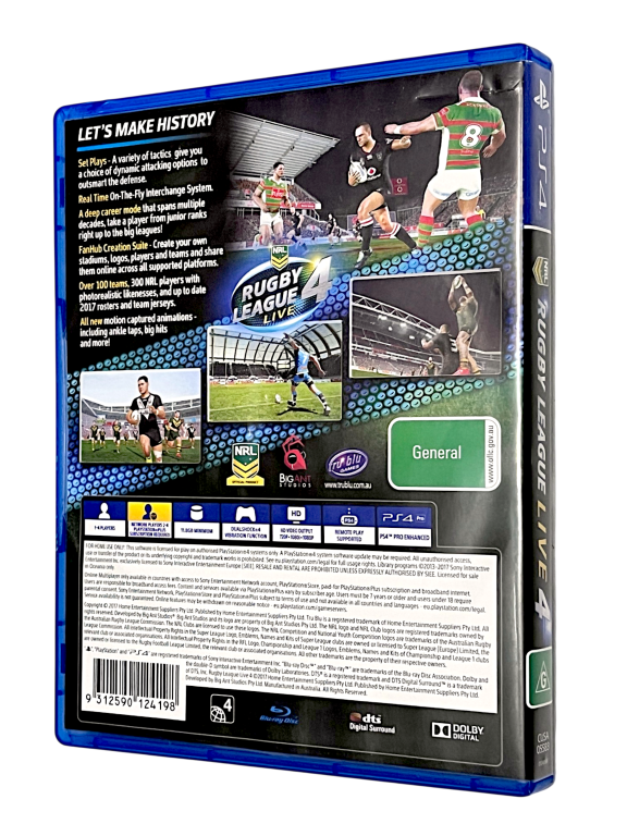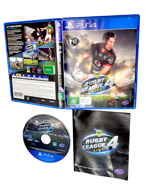 Excellent condition & 100% complete with contents: Rugby League Live 4 for SONY PlayStation 4 / PS4. This preowned game is excellent condition and includes case + cover + manual / booklet + game disc.