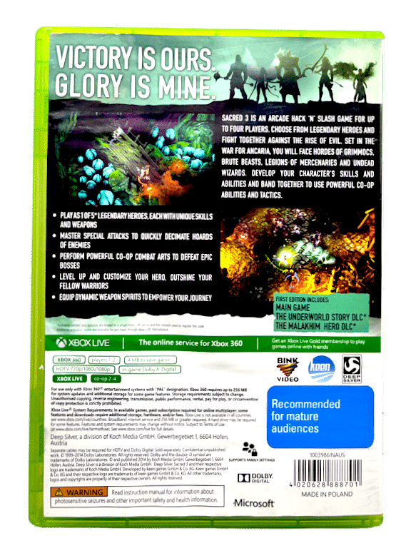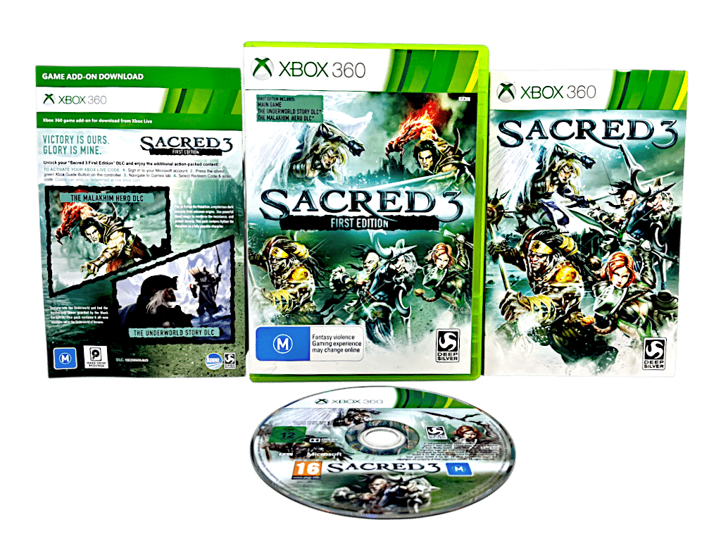 Excellent Condition & 100% Complete with Contents: SACRED III FIRST EDITION / Sacred 3 First Edition for Xbox 360. This preowned game comes complete with case, cover, manual / booklet, and game disc. Back of paper cover has some very gentle paper creasing, but this is purely cosmetic, not visible from the front, and the internal contents are fantastic.