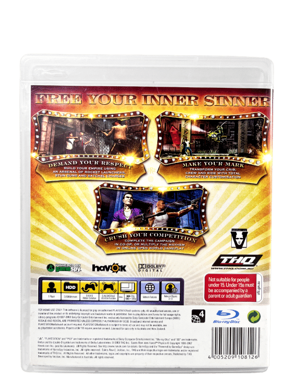 Excellent condition & 100% complete with contents: SAINTS ROW 2 for SONY PlayStation 3 / PS3. This preowned game features an Authentic Original Print case + cover + manual / booklet + game disc. A lovely and complete collector’s item.