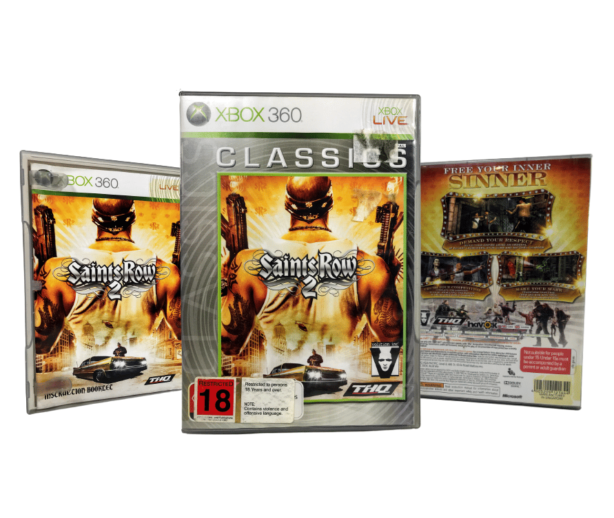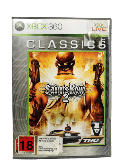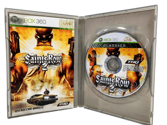 SAINTS ROW 2 for Xbox 360. This preowned game is in excellent condition with only the faintest of surface scratches, and includes each of the authentic Classics Edition case + cover + manual + game disc.