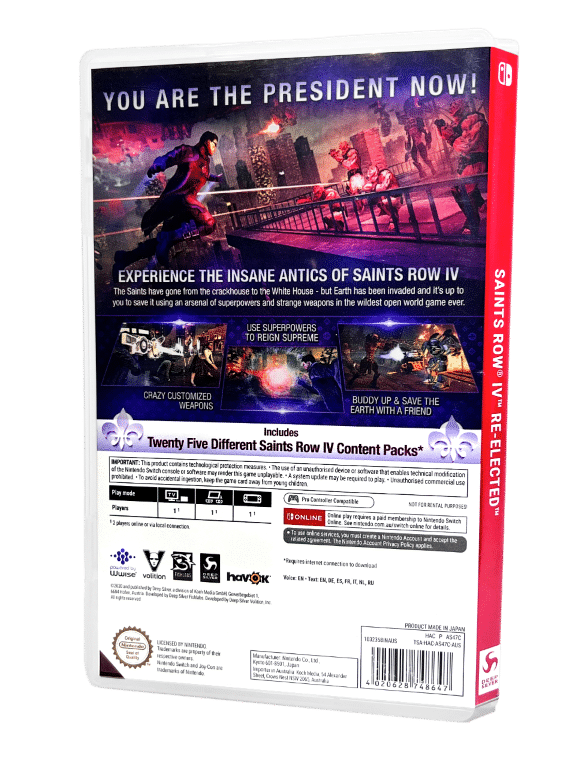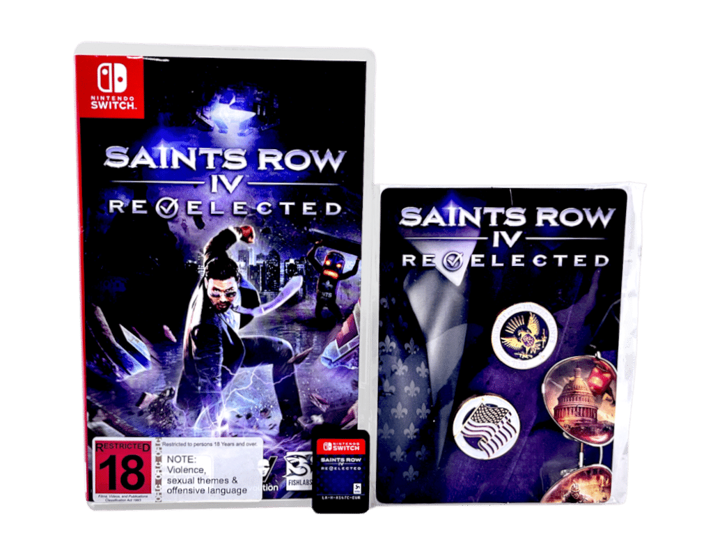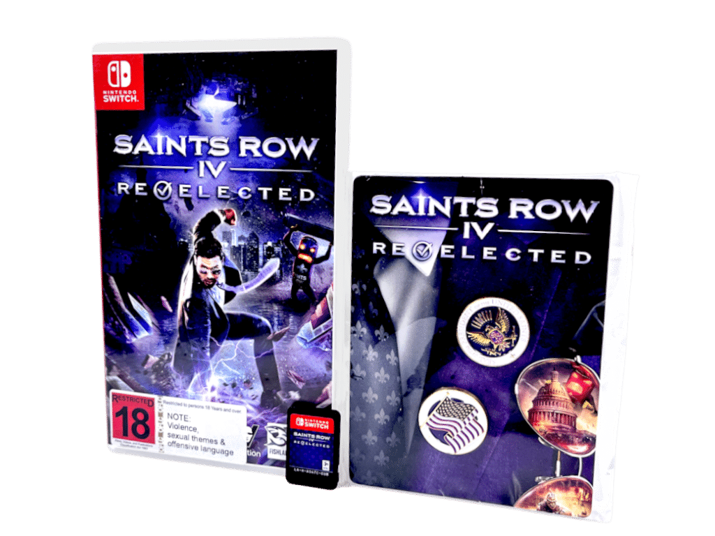 Rare Nintendo Switch COLLECTOR’S BUNDLE (GAME + BRAND NEW PLASTIC SEALED LIMITED RELEASE MEDALS): SAINTS ROW IV RE-ELECTED / Saints Row 4 Reelectd for Nintendo Switch. This preowned game + Collector’s Badges bundle is in superb condition. The badges are new sealed inside their packaging, and the game comes complete with case + cover + game cartridge.