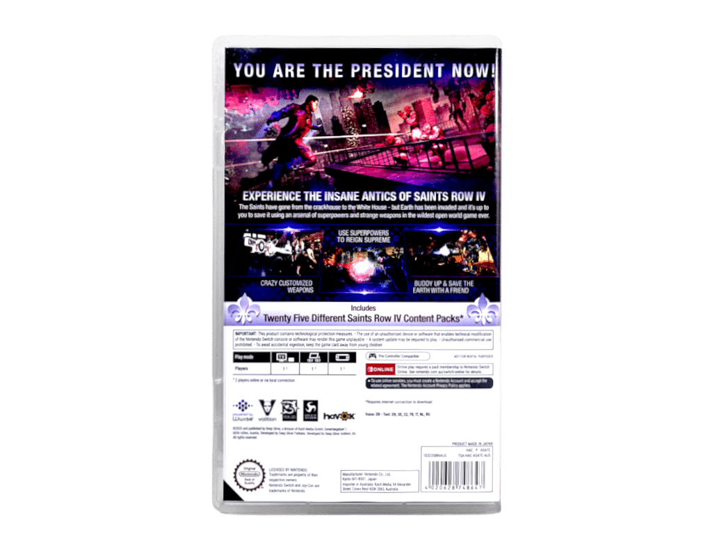 The Saints have gone from the crackhouse to the Penthouse, to The White House – but now it’s up to you to free the world from Zinyak and his alien empire, saving the world in the wildest open world game ever, playable for the first time on Nintendo Switch™.