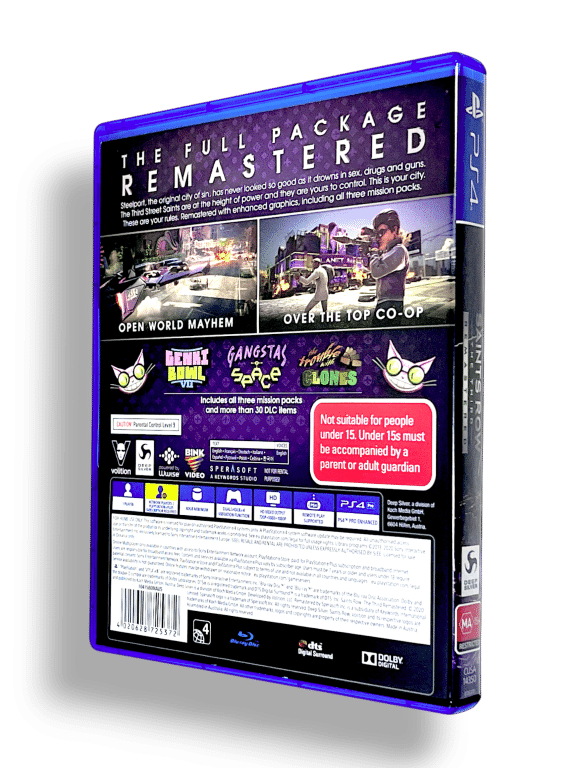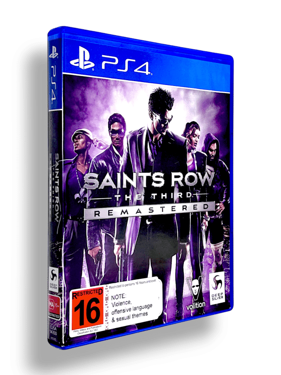Saints Row The Third Remastered for SONY PlayStation 4 / PS4. This preowned game is in excellent condition and comes complete with case + cover + game disc. Faint wavy lines in paper cover, but these extremely subtle and purely cosmetic. Overall, a tidy collector’s item and a rare game.