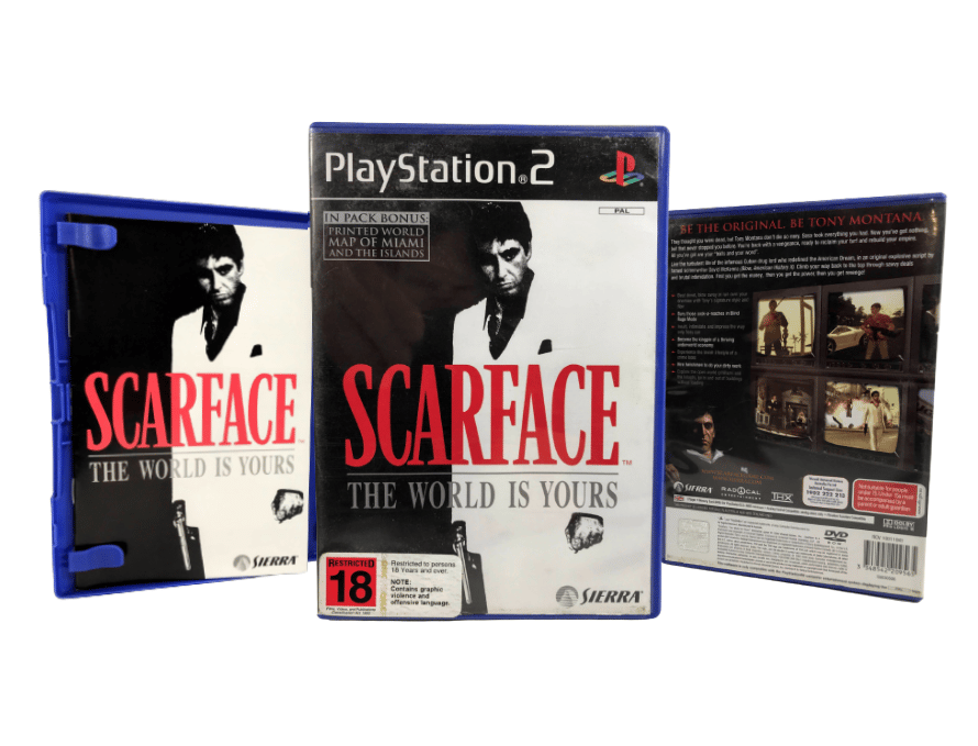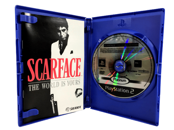 Excellent condition & 100% complete with contents: SCARFACE: THE WORLD IS YOURS for SONY PlayStation 2 / PS2. This preowned game comes complete with case, cover, manual / booklet, and the silver Platinum game disc.