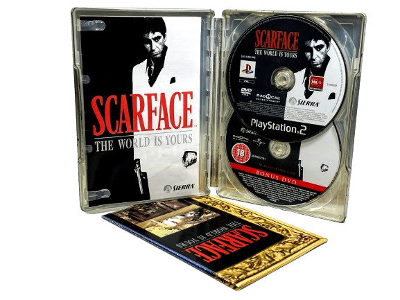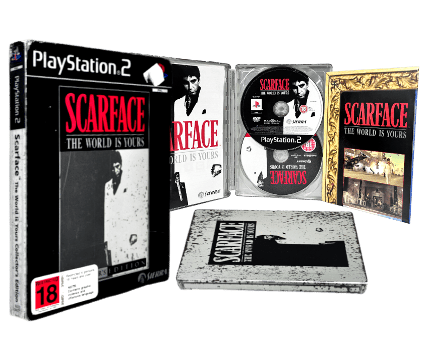 Rare Limited Steel Case Collector’s Edition 100% complete with contents: SCARFACE THE WORLD IS YOURS COLLECTOR’S LIMITED EDITION for SONY PlayStation 2 / PS2. This preowned authentic Limited Collector’s Steelbook Edition comes complete with all inner contents: