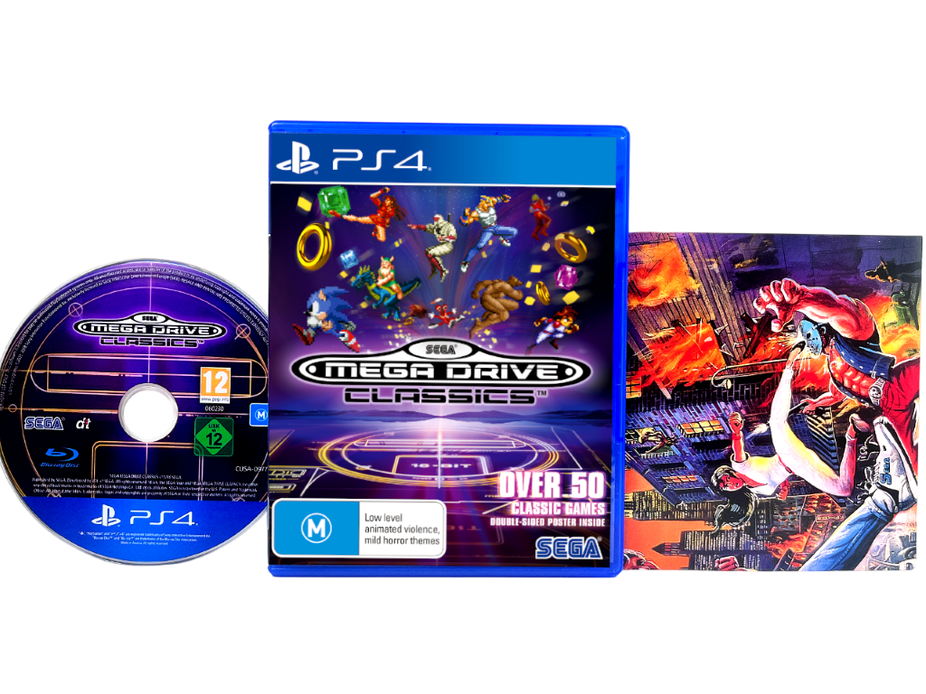 Genuine NZ Print (Collector’s Poster Edition) in Excellent Condition & Complete with Foldout Collector’s Poster: The SEGA MEGA DRIVE CLASSICS COLLECTION for SONY PlayStation 4 / PS4. This preowned game is in superb condition and comes complete with case + cover + double-sided collector’s poster + game disc. A tidy and complete collector’s item.