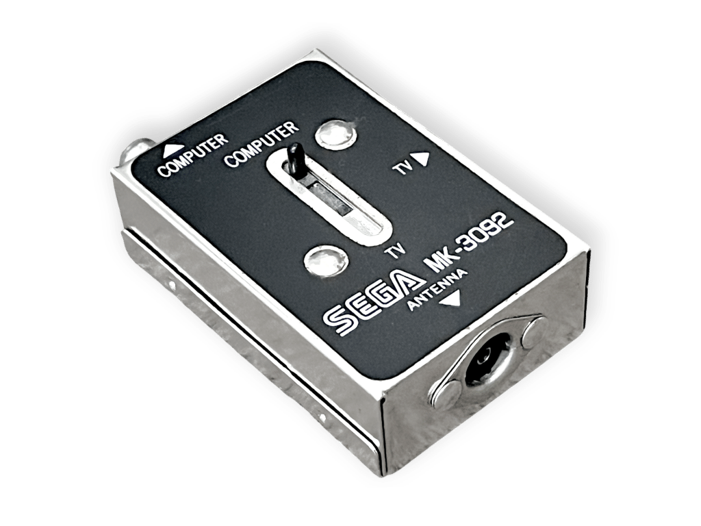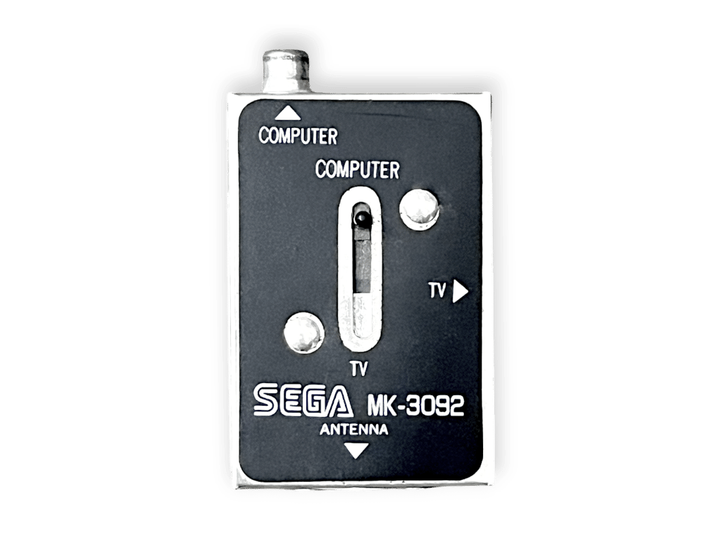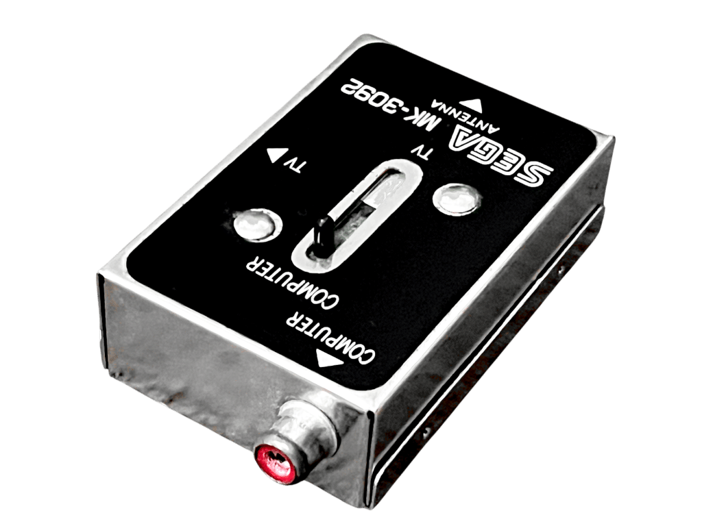 The SEGA MK-3092 RF switch box is a vintage accessory used to connect SEGA consoles to older televisions via antenna input. It features a toggle switch labeled “TV” and “COMPUTER,” allowing users to switch between broadcast signal and console output. The box includes circular connectors and a red RCA-style plug, housed in a metallic casing with the SEGA logo. This item is essential for retro setups and is a key component for authentic SEGA Master System or Mega Drive configurations. It’s a collector’s piece that reflects the analog era of console connectivity.