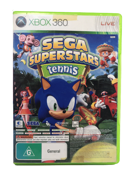 SEGA Superstars Tennis (Featuring SONIC) for XBox 360. This preowned game disc is in excellent condition and includes case, front of cover, manual / booklet, and game disc. *BACK OF PAPER COVER HAS BEEN CUT OFF. Front of cover only. Manual and game disc each in excellent condition.