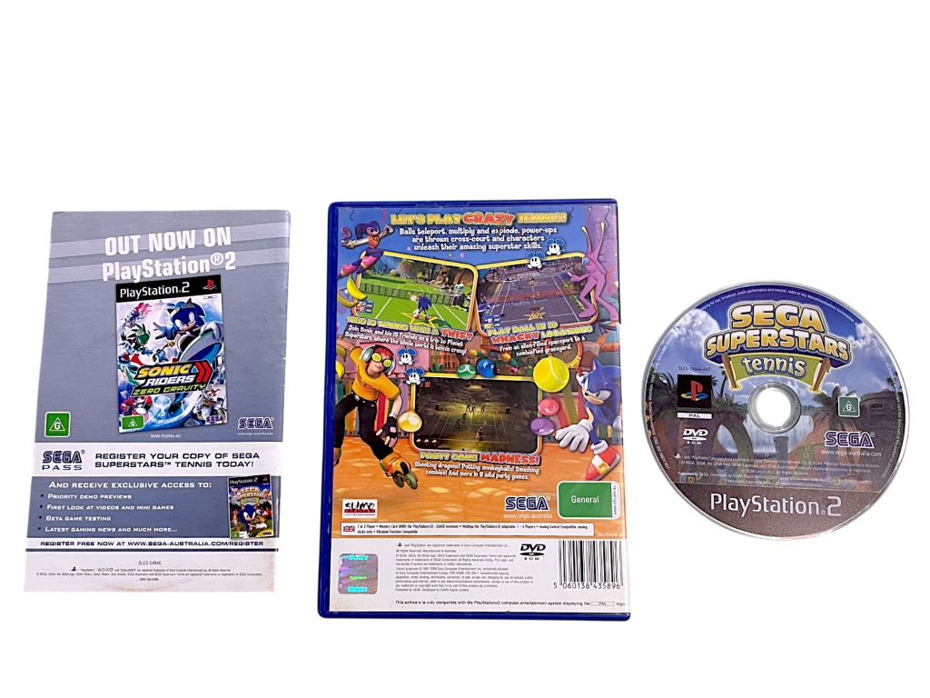 Sega Superstars Tennis (PS2). This pre-owned Sony PlayStation 2 game is in good condition with mild markings and superficial scratches only, which do not hinder gameplay or performance in the slightest. This game comes with a warranty. This game includes the pictured contents. Refer to the photographs.