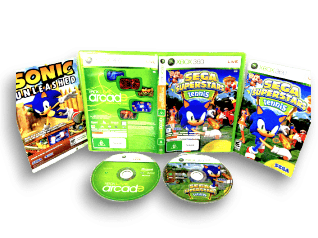 DOUBLE GAME BOX SET in good condition: The SEGA Superstars Tennis (Featuring SONIC) PLUS The XBox Live Arcade Games Compilation for XBox 360. This preowned TWO GAME BUNDLE is in excellent condition and comes complete with both game discs and one manual for SEGA tennis.