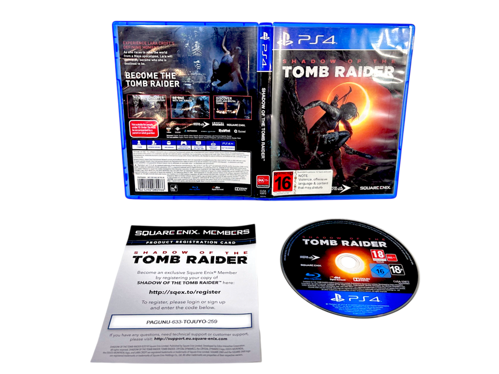 DESCRIPTION: This complete edition of Shadow of the Tomb Raider includes the case, disc, and Square Enix registration card. As the final chapter of Lara Croft’s origin trilogy, the story follows Lara as she races to save the world from a Maya apocalypse. Emphasizing stealth and jungle survival, players must master brutal tombs and navigate high-stakes underwater environments to complete Lara’s transformation into the Tomb Raider she was destined to be.