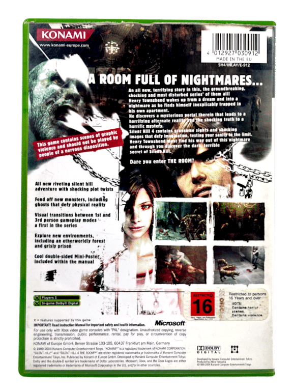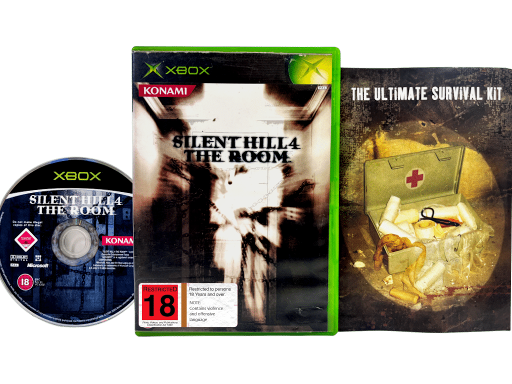 Silent Hill 4 The Room for Original Xbox. This preowned game is in good condition and includes pictured case + cover + “The Ultimate Survival Kit” booklet + game disc. Faint markings and feather scratches, but these are extremely minor and purely cosmetic. The disc is in very good condition and plays perfectly.