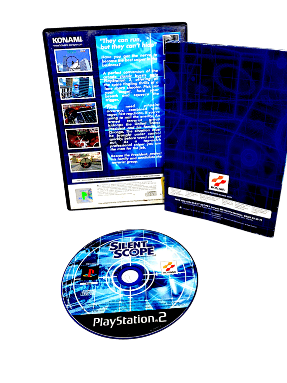 Silent Scope (PS2) Tidy and Complete. This preowned game is in good condition with mild surface imperfections and faint scratches only which do not affect gameplay or performance in any way. This game includes pictured case + cover/s + booklet/s + game disc/s.