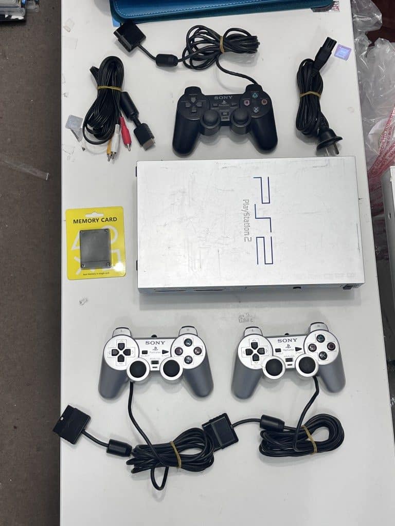 SILVER Phat SONY PlayStation 2 Console with PS2 Memory Card (new sealed), Sony AVI Leads, Power Lead + Controllers. This preowned Console is in good condition and perfect working working order with some surface markings and superficial scratches to the silver surface, but these are cosmetic imperfections only, and do not affect functionality in any way. INCLUDES THE FOLLOWING ITEMS – READ CAREFULLY: