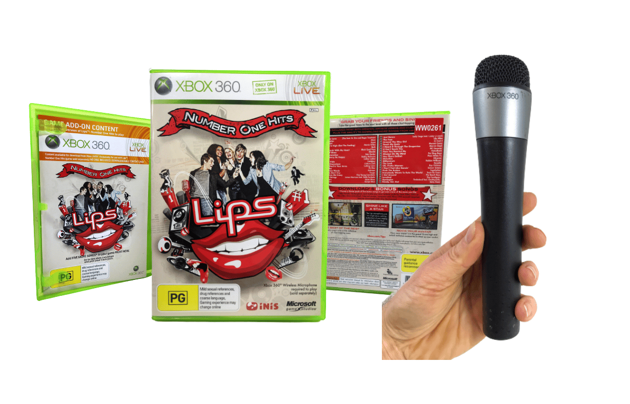 RARE FIND: OFFICIAL Xbox 360 LIPS Wireless Interactive Microphone + LIPS NUMBER 1 HITS Game to test your singing skills on Xbox 360. This preowned game bundle is in excellent condition and perfect working order. Well cared for since new – a lovely matching set.