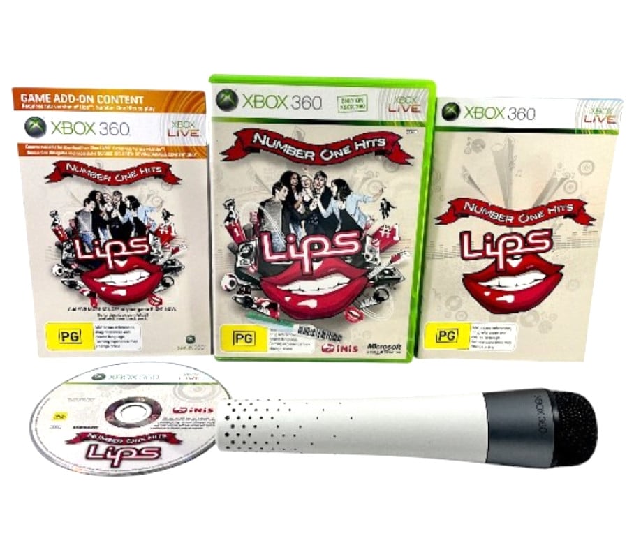 RARE FIND: OFFICIAL Xbox 360 LIPS Wireless Interactive Microphone + LIPS NUMBER 1 HITS Game to test your singing skills on Xbox 360. This preowned game bundle is in excellent condition and perfect working order. Well cared for since new – a lovely matching set – suitable as a gift.