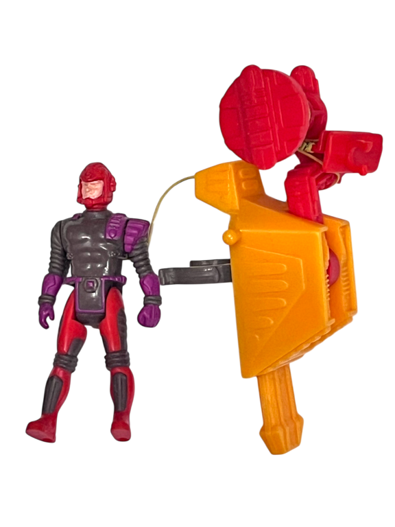 DESCRIPTION: This vintage action figure features a detailed red and grey character design along with a backpack launcher accessory mounted behind the figure. The accessory includes a missile-style launcher and wiring that connects to the backpack unit, suggesting the toy was originally part of a larger action figure play system. Figures like this were common in 1980s and 1990s action toy lines, where characters often included spring-loaded weapons, backpacks and removable accessories. Collectors often enjoy identifying the original toy line these figures belong to, making them interesting pieces for vintage toy collections. Whether displayed as a standalone figure or used as part of a toy collection, this piece reflects the imaginative action figure designs of the era.