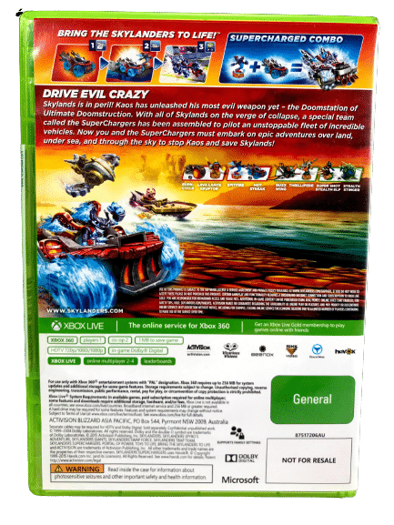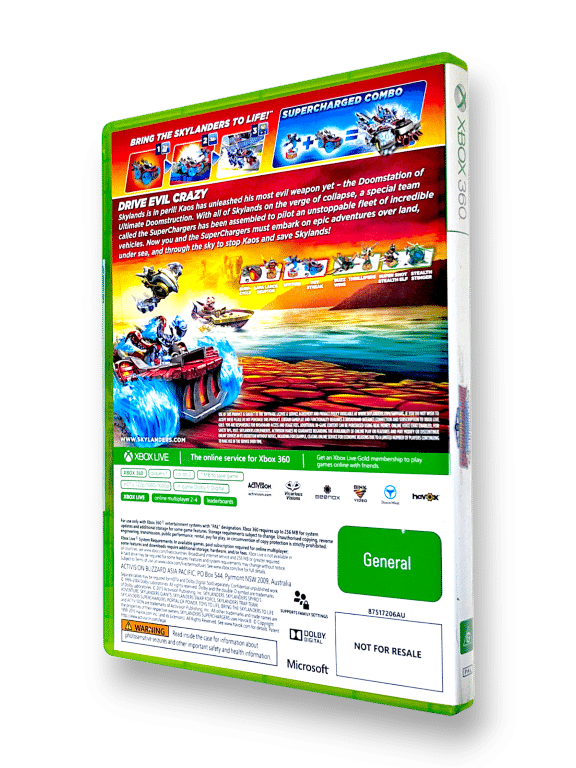 A brand-new class of Skylanders, known as SuperChargers are ready to buckle up and throw down in their fight against evil. Skylanders SuperChargers introduces 20 new SuperChargers toys and supports all 300+ Skylanders toys from previous games, enabling any Skylanders character to pilot land, sea or sky-based vehicles. SuperChargers also have special in-game abilities that help Portal Masters fight Kaos.