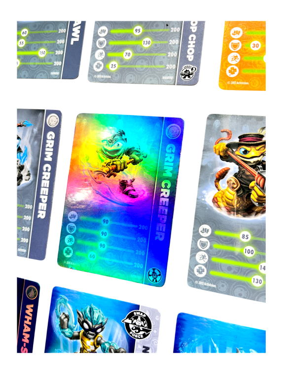 RARE BULK LOT of authentic Skylanders Swap Force Cards INCLUDING SOME LIGHTCORE EDITION SHINY HOLOGRAPHIC CARDS (e.g. Lightcore Wham Shell, Lightcore Warnado, Lightcore Grim Creeper, Lightcore Smolderdash). These preowned cards are in Excellent Condition and feature some rares in the mix. Refer photographs.