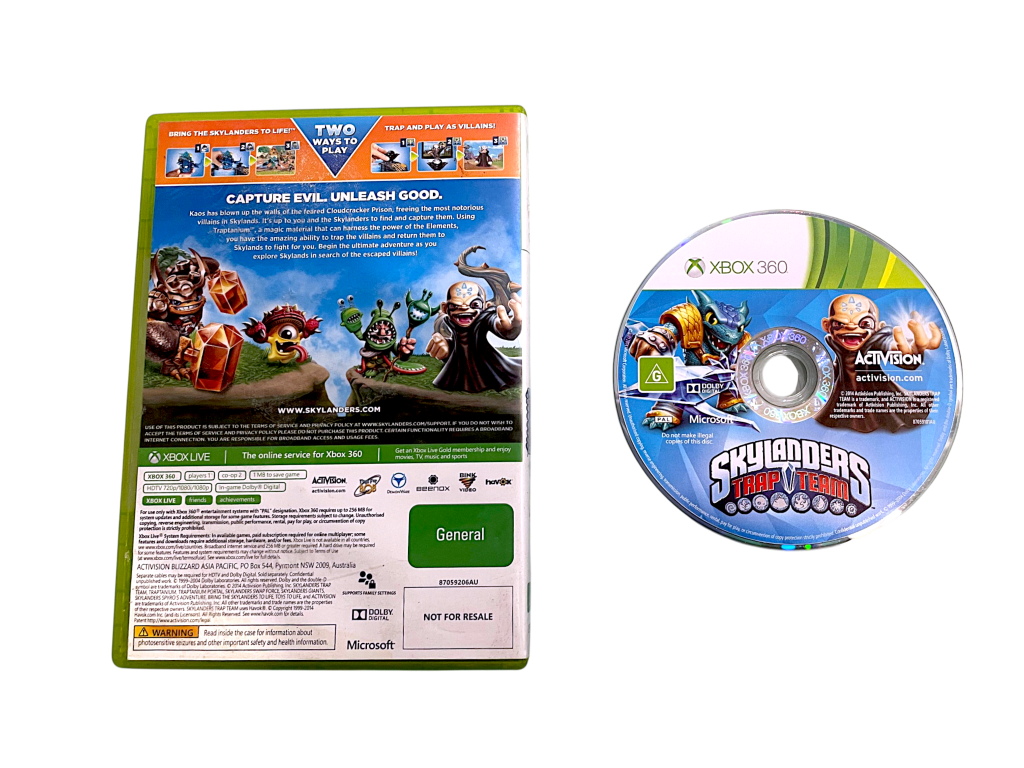 Skylanders Trap Team (Xbox 360). This pre-owned game is in good condition with mild disc surface imperfections only which do not hinder gameplay or performance in any way. This game includes the pictured case and contents. Refer to the photographs.
