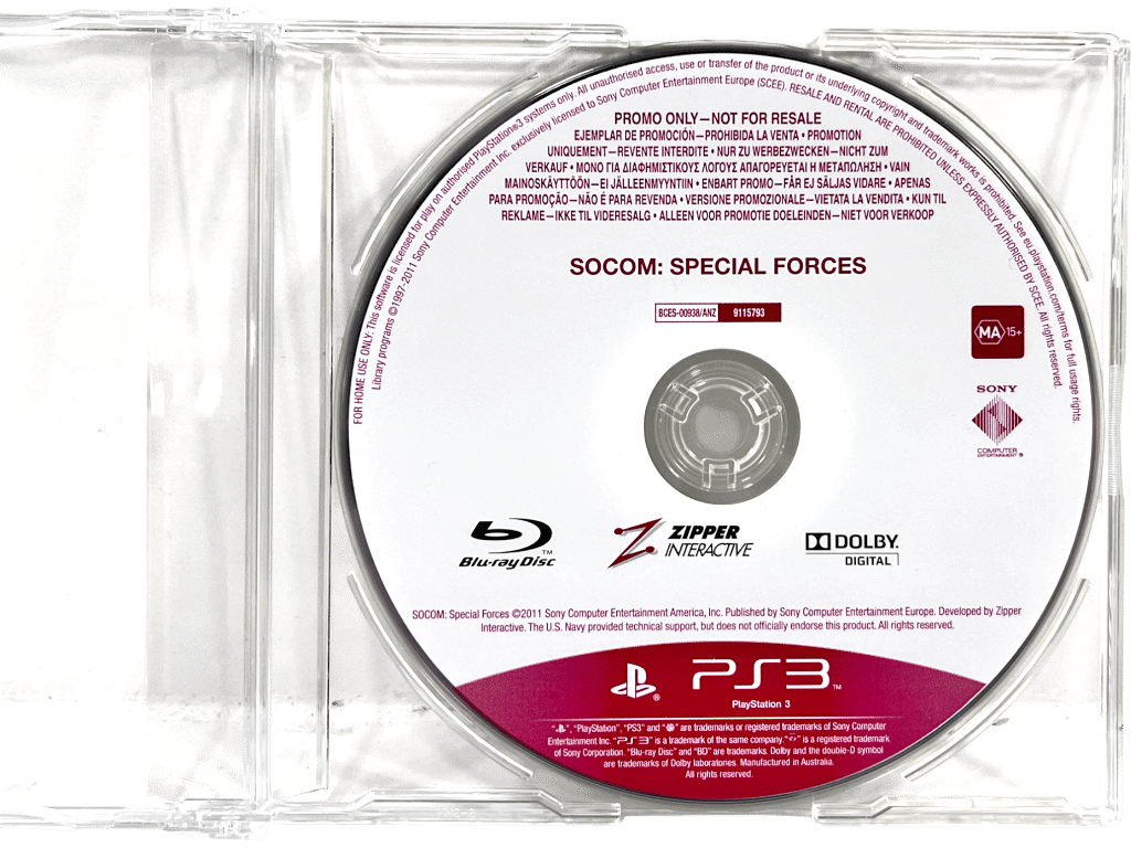 Rare authentic pre-release game disc in mint condition & complete with matching clear slim CD case: SOCOM Special Forces for SONY PlayStation 3 / PS3. This preowned game disc is in pristine condition and is a genuine pre-release edition (with the FULL SOCOM Special Forces game on the game disc). This release came inside a slimline CD case without paper cover art – this item being a tidy and complete collector’s item comprising two items: the original transparent slimline CD case + game disc.