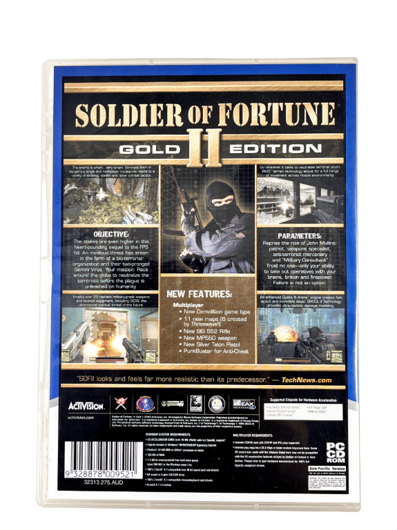 GENUINE GOLD EDITION: Soldier of Fortune 2 GOLD EDITION for PC. This preowned game is in superb condition and includes case + cover + both AUTHENTIC “GOLD EDITION” game discs.