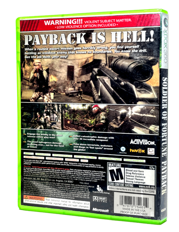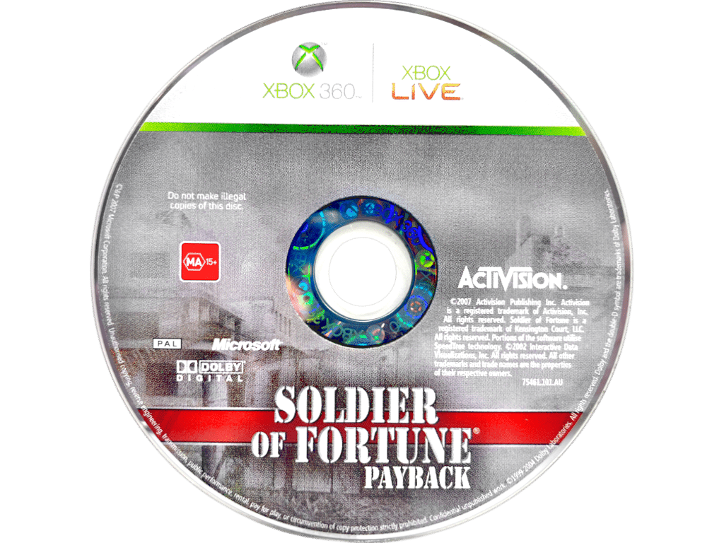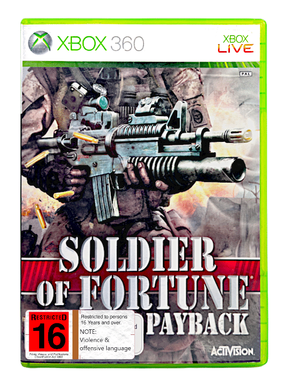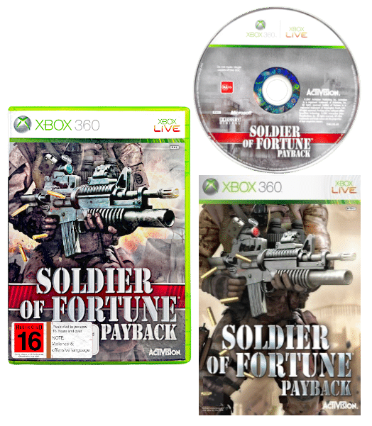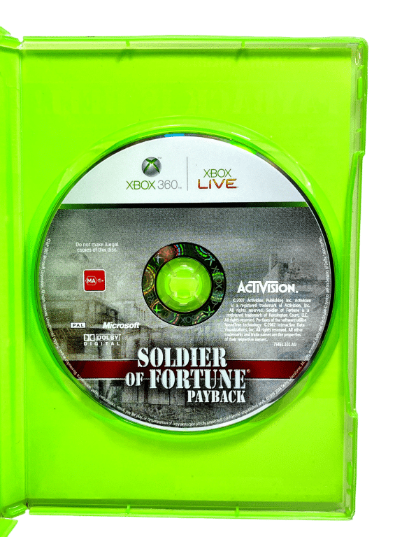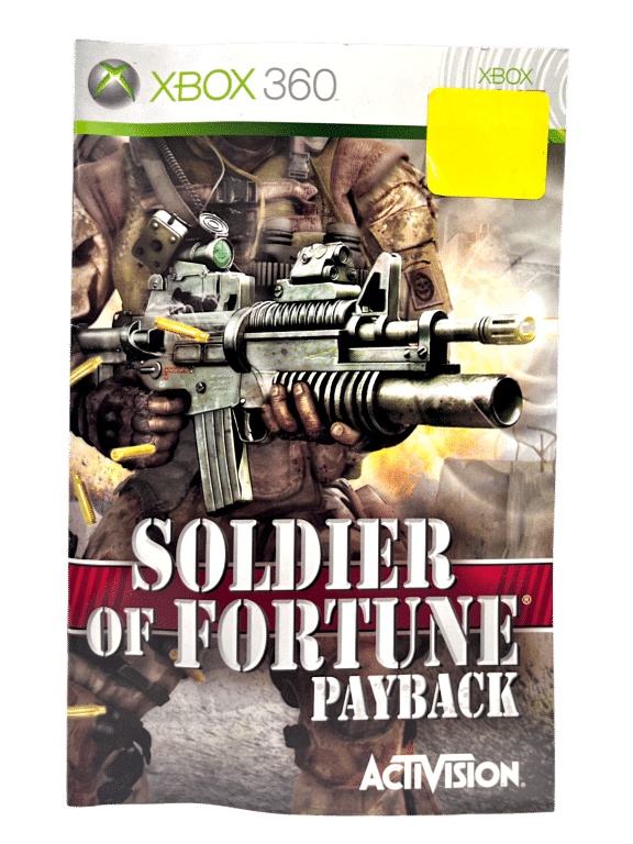 Excellent condition & 100% complete with contents: SOLDIER Of FORTUNE PAYBACK for XBox 360. This preowned game is in superb condition and comes complete with case + cover + manual / booklet + game disc. A yellow sticker on the front cover of the manual, and the disc has the faintest of markings and superficial feather scratches, but these are so subtle that they are only visible up close if you are looking hard for them under reflective light. The disc is in very good condition and plays perfectly, and all other contents are tidy.