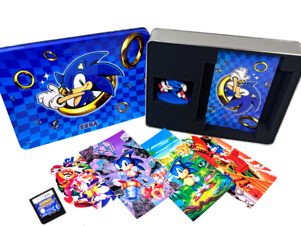 RARE FIND: Official Limited Collector’s Edition (LARGE TIN + INNER CONTENTS + GAME): SONIC CLASSIC COLLECTION COLLECTOR’S BOX + ARTBOOK + SONIC FIGURINE + SONIC POSTCARDS + GAME CARTRIDGE. Nintendo DS Edition. This preowned Collector’s Steel Tin Bundle is in excellent condition as pictured, with all inner contents superb. Includes the pictured game cartridge – in excellent condition, without its plastic game case. Large steel tin + lid + hardcover artbook + 4 x collector’s postcards + Sonic toy figure + Sonic Classics Collection Nintendo DS Game Cartridge. A lovely collector’s set. Refer photographs.