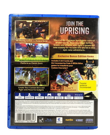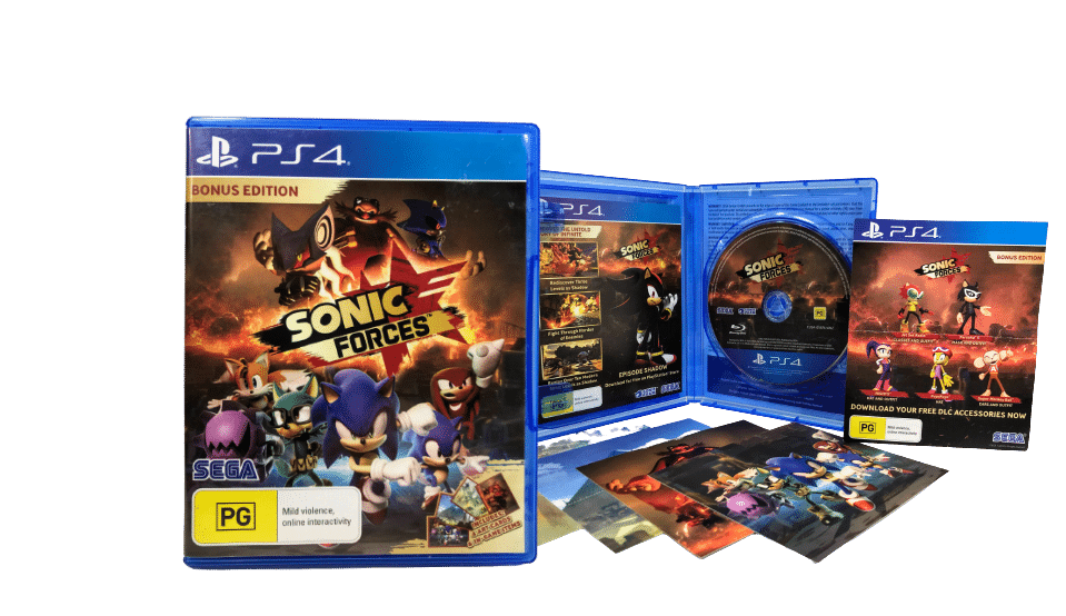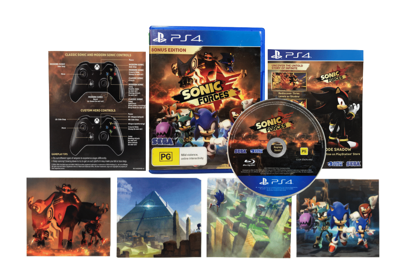 Excellent condition & 100% complete with ALL contents including BOTH instruction cards AND collector’s cards: SONIC FORCES (Game complete with Sonic Forces Collector’s Cards) for SONY PlayStation 4 / PS4. This preowned game comes complete with case, cover, instruction cards, large collector’s cards, and game disc. A tidy collector’s bundle.