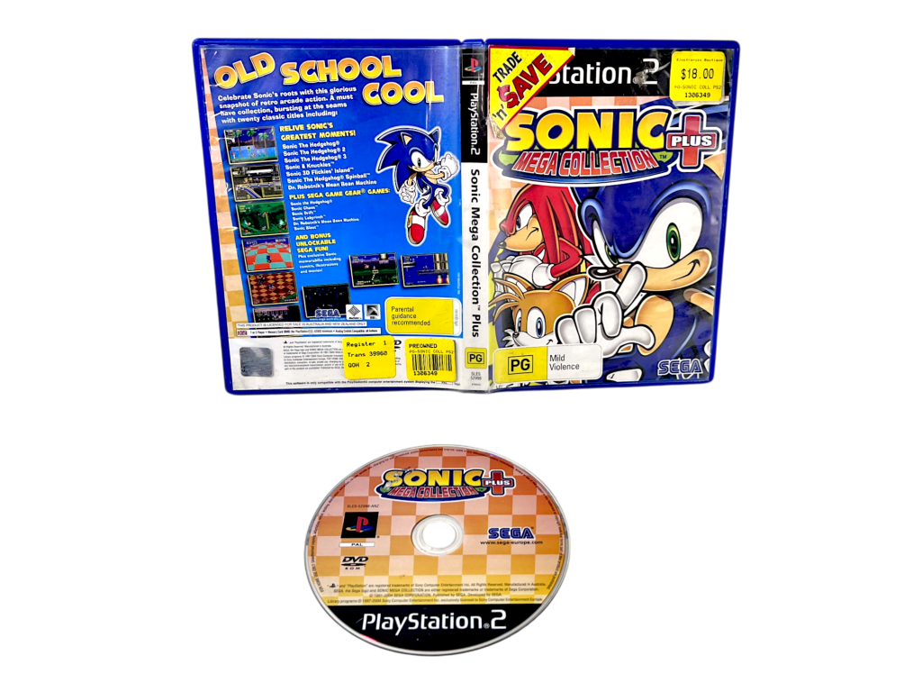 DESCRIPTION: Sonic Mega Collection Plus on PlayStation 2 compiles classic Sonic titles from the Sega Genesis era. Featuring multiple games in one package, it offers retro platforming gameplay. This complete copy includes case and disc. Ideal for collectors and fans of classic Sonic adventures.