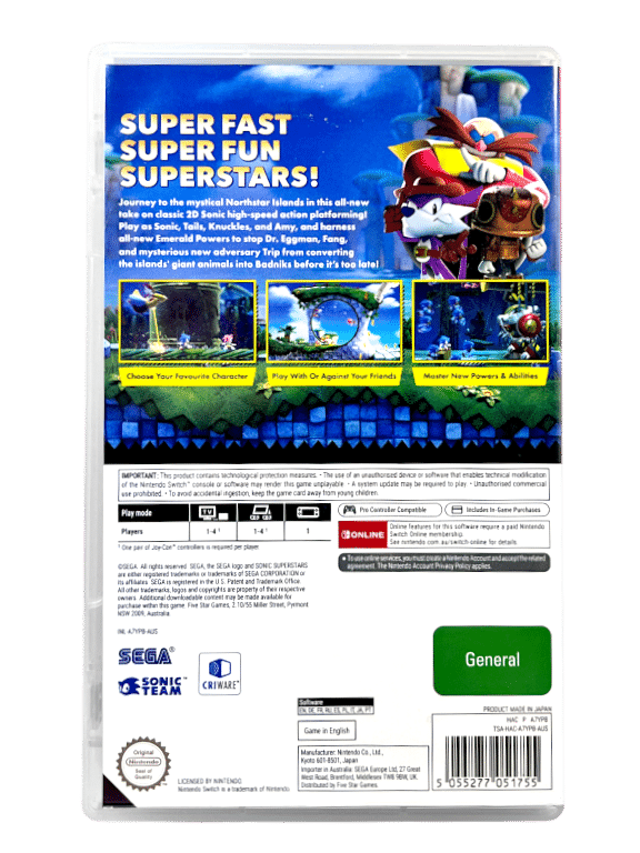 SONIC The Hedgehog in SONIC SUPERSTARS / SONIC SUPER STARS / SONIC SUPER-STARS for Nintendo Switch. Preowned. Mint condition.