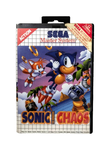 SONIC THE HEDGEHOG CHAOS / SONIC CHAOS for SEGA Mastersystem. This preowned game is in good condition, and includes original case, cover, and game cartridge. Cover and cartridge both very tidy. Case has a small plastic split at the top of the spine, but this does not affect its appearance or functionality in any way.