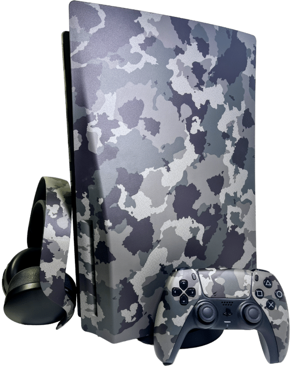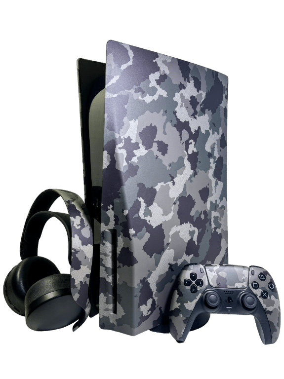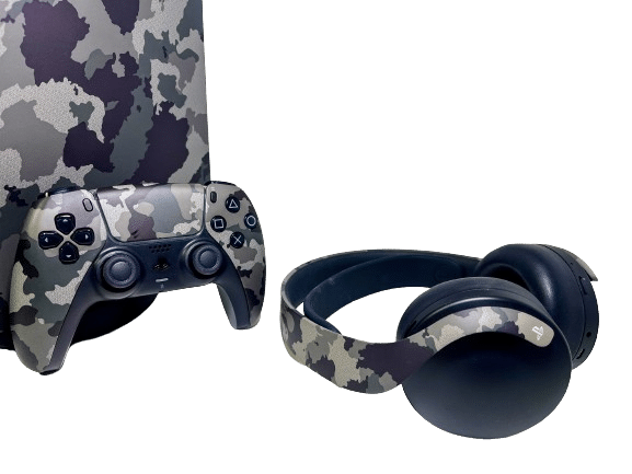 Complete Grey Camouflage PS5 Bundle in Mint Condition (as new): SONY PlayStation 5 – PS5 GREY CAMOUFLAGE Console complete with matching GREY CAMOUFLAGE SONY PS5 Controller + GREY CAMOUFLAGE Official Sony PlayStation 5 Wireless Headset (with wireless USB adapter) + Console Stand + HDMI Lead + USB-C Lead + Power Lead. This preowned PlayStation 5 is in Mint condition with only the mildest of use.